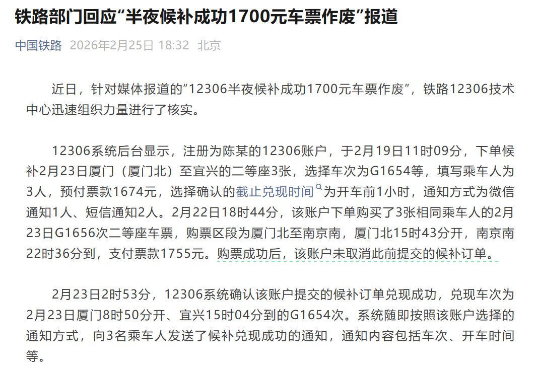 2月25日,中國鐵路微信公眾號發(fā)文稱,近日,針對媒體報道的“12306半夜候補成功1700元車票作廢”,鐵路12306技術(shù)中心迅速組織力量進行了核實。