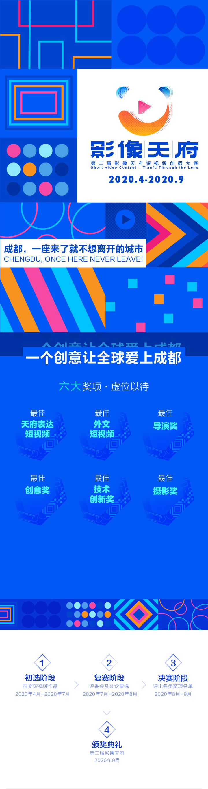 “第二屆影像天府·短視頻創(chuàng)攝大賽”于2020年4月正式啟動(dòng),邀約全球創(chuàng)攝愛好者續(xù)寫“成都,一座來(lái)了就不想離開的城市”篇章,征集優(yōu)質(zhì)影像作品。本次大賽設(shè)置最佳天府表達(dá)短視頻、最佳外文短視頻、最佳導(dǎo)演獎(jiǎng)、最佳創(chuàng)意獎(jiǎng)、最佳技術(shù)創(chuàng)新獎(jiǎng)、最佳攝影獎(jiǎng)六大專業(yè)。評(píng)委包括中國(guó)電影家協(xié)會(huì)副主席,上海電影家協(xié)會(huì)主席任仲倫;艾美獎(jiǎng)得主,美國(guó)著名影視導(dǎo)演、制片人Mark