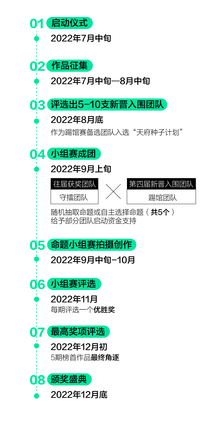 為鼓勵視頻創(chuàng)作,2022年將繼續(xù)啟動“天府種子計(jì)劃”,高標(biāo)準(zhǔn)、高質(zhì)量生產(chǎn)以成都為主題/背景的影像IP。該計(jì)劃將通過“揭榜掛帥”的模式,發(fā)布5-10個提供啟動資金的“種子”項(xiàng)目,通過邀請社會報名、機(jī)構(gòu)推薦的形式,征集評選出視頻行業(yè)有潛力的承接團(tuán)隊(duì)、個人。主辦方將組織專業(yè)評審對入圍團(tuán)隊(duì)/個人遞交的資料進(jìn)行評議打分,選出各個“種子”項(xiàng)目的承接方并予以執(zhí)行。